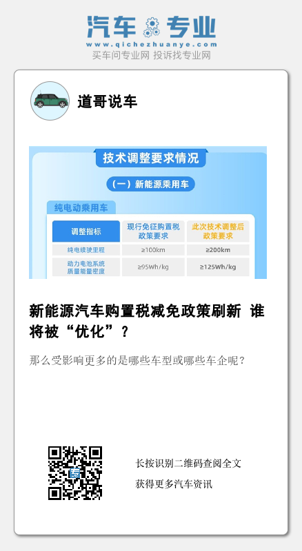 不过,还是有不少车型被“优化”了。其中比较有意思的一点是,按照此次技术调整后的政策要求,纯电动乘用车续驶里程不低于200km,现行免征购置税政策要求纯电动乘用车续驶里程为不低于100km。