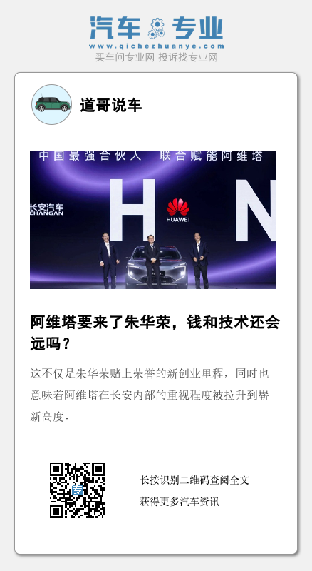 总的来看,朱华荣出任阿维塔董事长算是行业的标志性事件,这不仅是朱华荣赌上荣誉的新创业里程,同时也意味着阿维塔在长安内部的重视程度被拉升到崭新高度。尽管目前阿维塔还没有更多的执行策略出现,但可以预见的是其将加快发展速度。