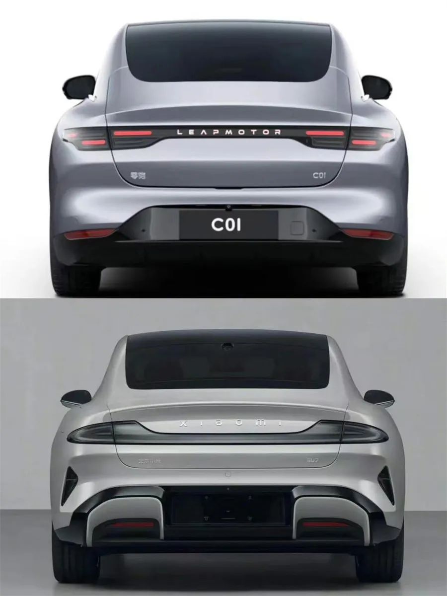 从前脸和侧面造型来看,很有保时捷Taycan的韵味,被有些网友戏称为“米时捷”,也有网友称从中看到了迈凯轮、保时捷、特斯拉、林肯、蔚来、零跑等品牌的影子。更是有不少博主将小米SU7的尾部和零跑C01的尾部对比,而配文中“把logo这么遮住,你们就说像不像零跑C01”。