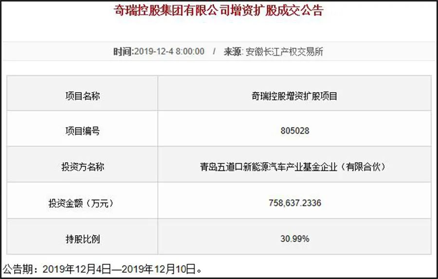 有山东政界人士向《财圈社&道哥说车》编辑透露,一般政府投资的钱5年内要收回。资料显示,青岛五道口基金成立于2019年8月22日,青岛市即墨区是其重要的基石投资者,如果按照五年回收期的话,距离青岛五道口回收资金还有9个月的时间。而就在去年2月,立讯精密以100.54亿元从青岛五道口手中收购奇瑞控股19.88%股权、奇瑞汽车7.87%股权和奇瑞新能源6.24%股权。数据显示,此次股权变更后,青岛五道口所持奇瑞控股降至26.89%。