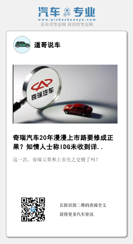 编辑注意到,奇瑞最近传出上市消息的苗头是IDG资本考虑以70亿元人民币收购奇瑞汽车母公司股权,有知情人士透露,观望罢了,IDG这么精明的公司怎么可能会一时冲动做接盘侠?当然,IDG也不会发声明否认,毕竟奇瑞是国内唯一一个没有上市的整车集团,这块肥肉自然也不会轻易放过。