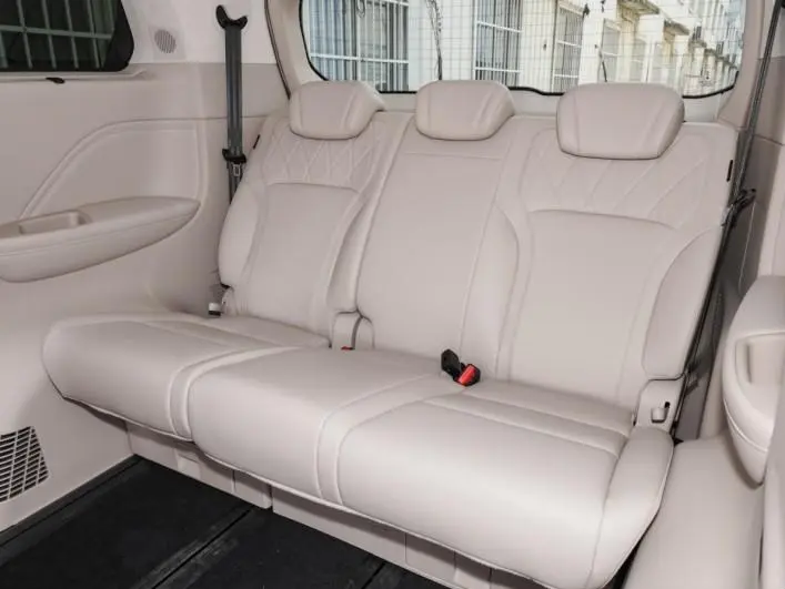 三排位置,空间不用担心,表现和D9、GL8那些差不多。并且它的坐垫,靠背,都是比较厚实的,所以大腿的支持,靠背靠过去的可靠感,都比较强。此外,像充电口,靠背可调、杯座、隐私玻璃这些也都是标配。