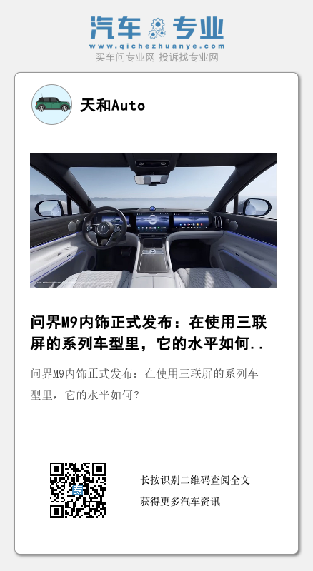 综上所述,对于问界M9的三联屏个人无法给出高分评价,感觉和奇瑞星途或奔驰EQS等车的三联屏设计水平相当;智能汽车难免要用大尺寸的屏幕,所以屏幕的设计应当考虑到与中控台和内饰整体的融合,屏幕不是主体而是亮点,屏幕的设计应当是衬托内饰整体的某种感觉而不应该喧宾夺主。