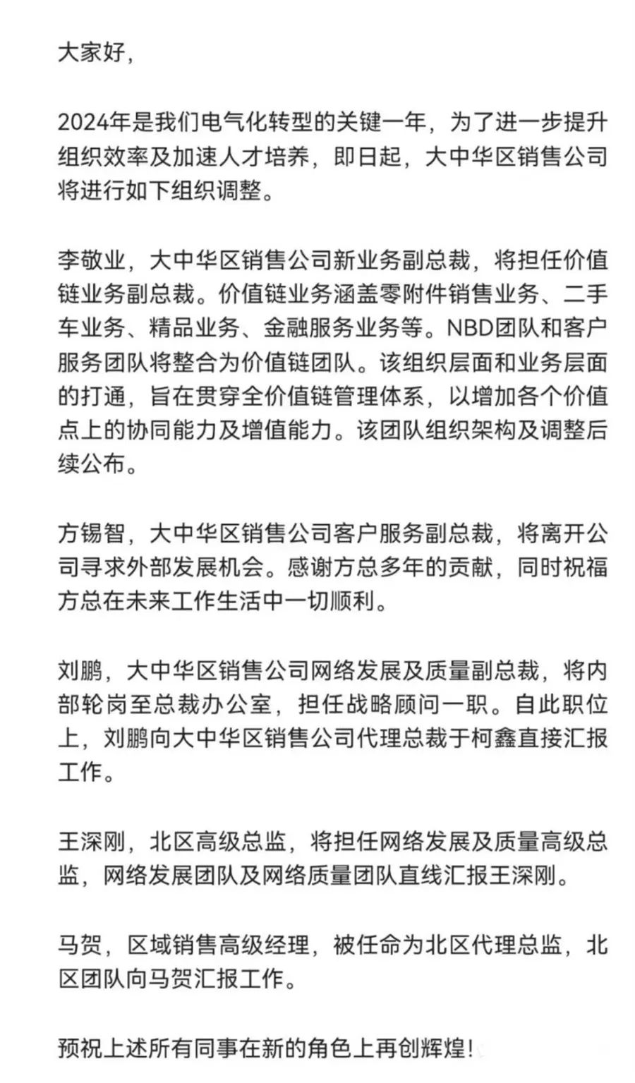 据网传沃尔沃一份内部邮件内容:沃尔沃大中华区销售公司客户服务副总裁方锡智,将离开公司寻求外部发展机会;原网络发展及质量副总裁刘鹏,将内部轮岗至总裁办公室,担任战略顾问一职。