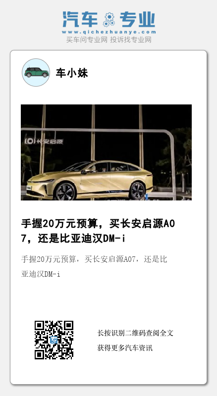 如果手中有20万元预算,虽说目前汉DM-i限时优惠后进入到了这个预算区间内,但长安启源A07同样也有优惠政策,享受1999元抵1万元现金购车款等。此外,凭借更强的科技感坐拥较高的性价比。因此,角师傅个人更偏向长安启源A07,不知大家有何看法,欢迎评论区中留言讨论。