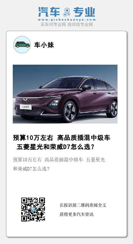 写在最后:两款车如何选呢?五菱星光更多是那些在乎颜值、油耗,比较刚需的消费者选择;而荣威D7整体在配置、动力、车身尺寸以及智能化功能体验更加出色,当然,这也是多花4000元换来的,但笔者觉得性价比比较高,怎么选,相信大家心里已经很清楚了。