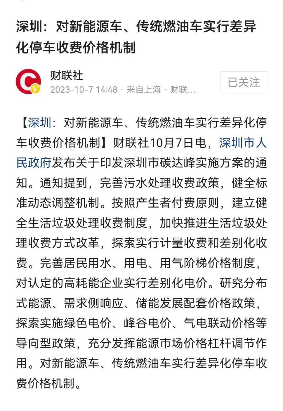 像深圳在今年10月出台新政策,对新能源车、传统燃油车实行差异化停车收费价格机制。