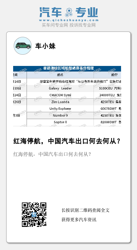 回到前文所述,如果曼德海峡事件持续致使苏伊士运河关闭,哪怕是短短数日,都将打乱这一航线中所有船只规划,中国汽车出海难以避免遭受冲击。