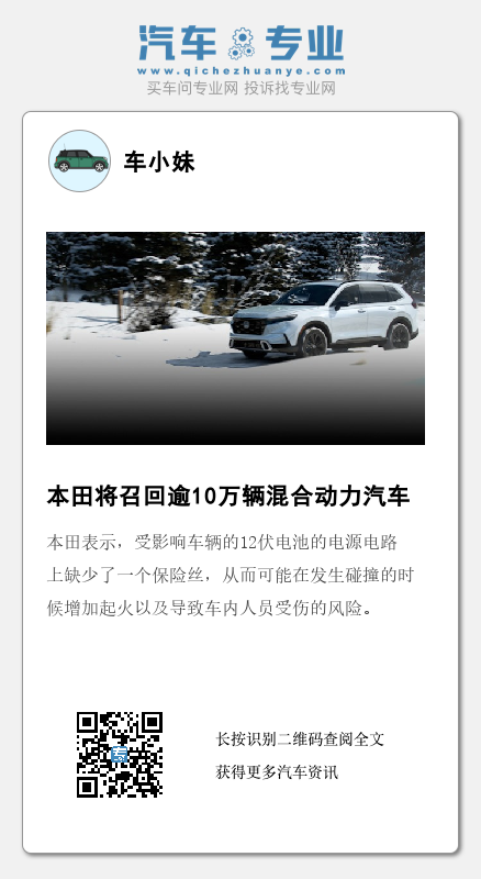 本田表示,该公司计划于明年1月29日向车主邮寄通知函。本次召回的车型包括2020至2022款的本田CR-V混合动力汽车。