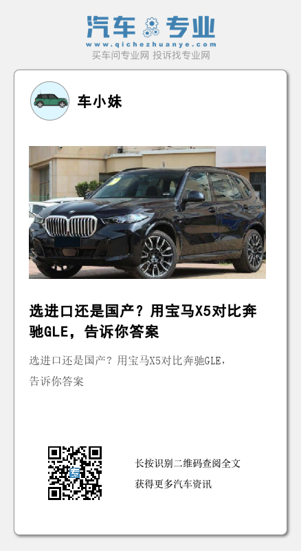 从目前的市场状况来说,以61.50万元国产落地的宝马X5确实会显得更划算一些,它全系与69.98万元进口入门的奔驰GLE级都会有8万左右的价格优势,而且在运动性能与动态操控方面也的确更加到位。更重要的是,它的电子架构升级会带来更多辅助驾驶与信息娱乐的智能支持,整体上会显得更“新”一些。不过,若是更追求乘坐的舒适与驾驶的稳定,这进口而来的奔驰GLE虽然科技上“老”了一些,但仍会是那个更优选择。