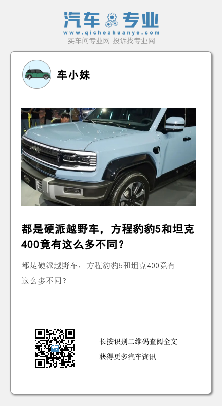 结束语:30万元左右的预算,买一款性能强大的新能源越野车,这在两年前还是不敢想象的,这也是新能源时代带来的福利。如果你比较认可长城在越野车领域的积累,以及它在技术上的可靠性,那么坦克400还是可以考虑的;如果你认可比亚迪在新能源方面的技术,同时又喜欢尝鲜,那么方程豹豹5就是不错的选择。