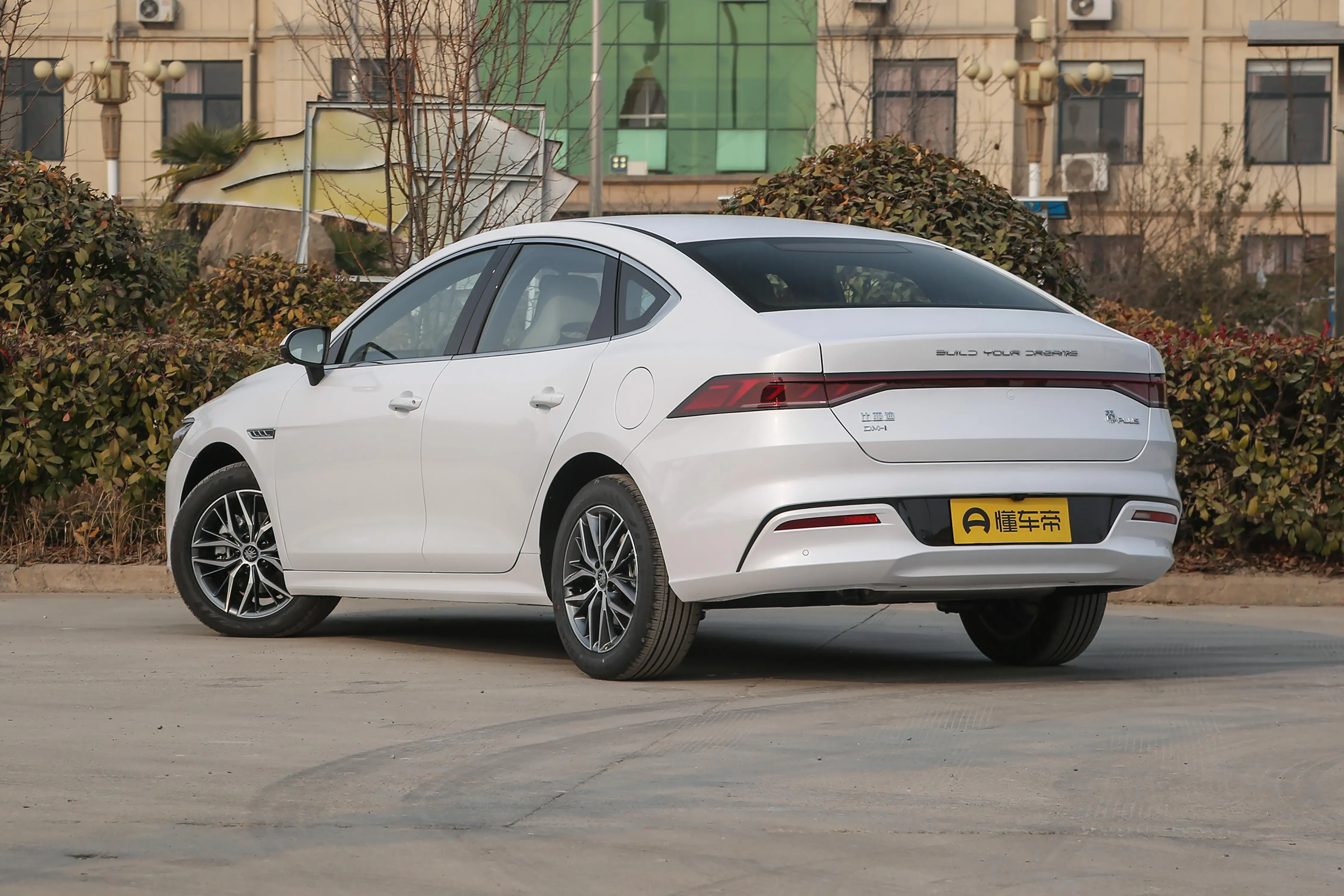 车顶向后微微下坡,形成了类似溜背的造型,这不仅增加了美观度,也对空气动力学性能有所帮助。车辆后部设计简洁,尾灯采用贯穿式设计,增强了车辆的辨识度。后保险杠下方的黑色装饰条和中央的“BUILD YOUR DREAMS”标语,进一步凸显了品牌特色和设计细节。车身尺寸方面,秦PLUS DM-i的长宽高为4765x1837x1495mm,轴距为2718mm,定位紧凑型车。