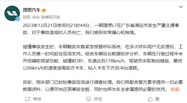 2023年12月21日夜间约21时44分,一辆理想L7在广东省清远市发生严重交通事故,对于事故造成的人员伤亡,我们感到非常痛心和惋惜。