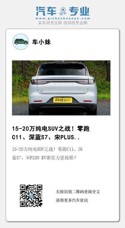 经过对比,三车优势各异。宋PLUS EV品牌力抢眼,整体产品力相对均衡;深蓝S7标配的座椅配置更丰富,加速成绩三车第一;零跑C11智驾配置更丰富,续航优势较大,乘坐空间不输另外两车,细节设计也足够贴心,诸如配备了更大的全景天幕、三车仅有的后排多媒体控制屏,并提供选装价值较高的配置包,价格也与另外两车一致,所以我认为零跑C11更容易获得追求质价比用户的认可,斩获更高的市占率。对此,大家怎么看?欢迎一起讨论交流。