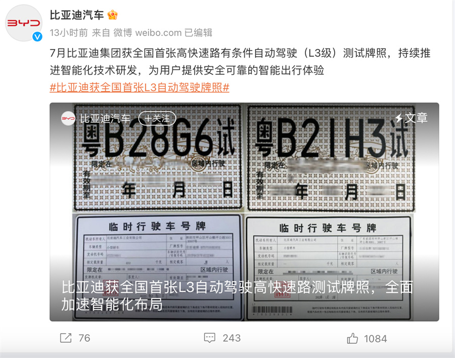 沉寂了5个月,比亚迪终于将7月获得的高快速路段有条件自动驾驶(L3级)测试牌照拿出来晒了。是因为忍不住了吗?