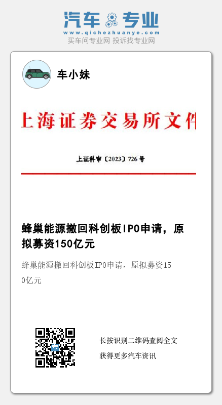 文件显示,日前,蜂巢能源和保荐人中信证券股份有限公司分别向上交所提交了《蜂巢能源科技股份有限公司关于首次公开发行股票并在科创板上市项目撤回申请文件的请示》(峰能字〔2023〕第016号)和《关于蜂巢能源科技股份有限公司首次公开发行股票并在科创板上市项目撤回申请文件的请示》(中信证券〔2023〕1987号),申请撤回申请文件。根据《上海证券交易所股票发行上市审核规则》第六十三条的有关规定,上交所决定终止对蜂巢能源首次公开发行股票并在科创板上市的审核。