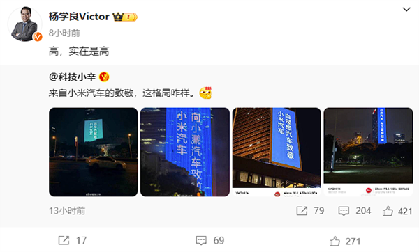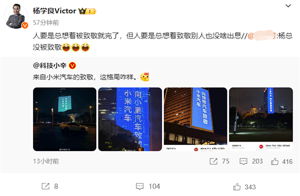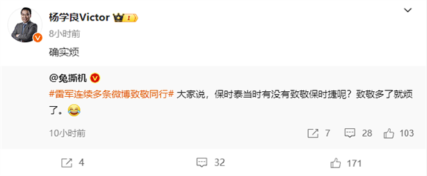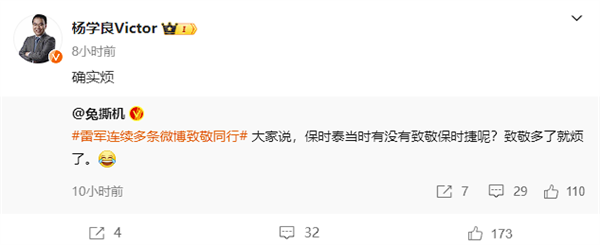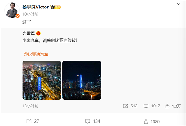 随后他发布的微博下面总会出现类似的留言,昨日晚间,在雷军晒大楼照片向比亚迪致敬时,杨学良转发并表示“过了”,评论区再度被疯狂挤占。