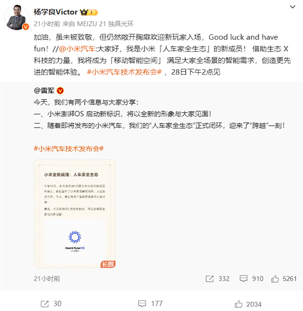 实际上一开始他也表达了对小米汽车的欢迎,昨天最开始的微博为“加油,虽未被致敬,但仍然敞开胸扉欢迎新玩家入场,Good luck and have fun!”