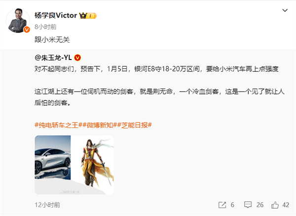 杨学良随后还转发微博表示“我不能理解、确实烦、我们不跟小米比、跟小米无关、高实在是高等”,昨日深夜,还发布微博称“2024,是致敬的元年,睡了,晚安。”