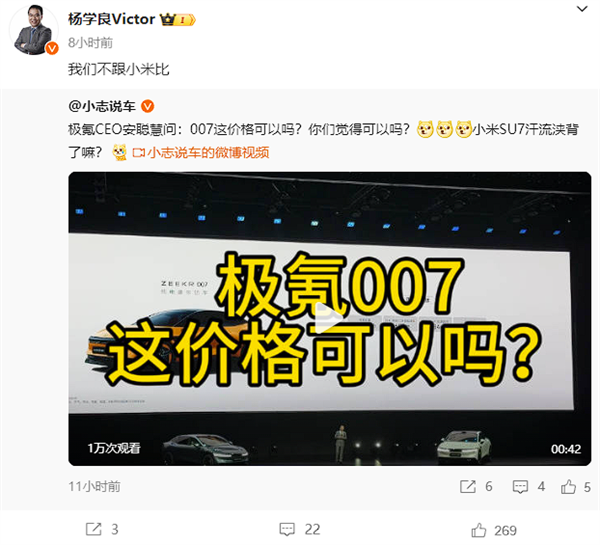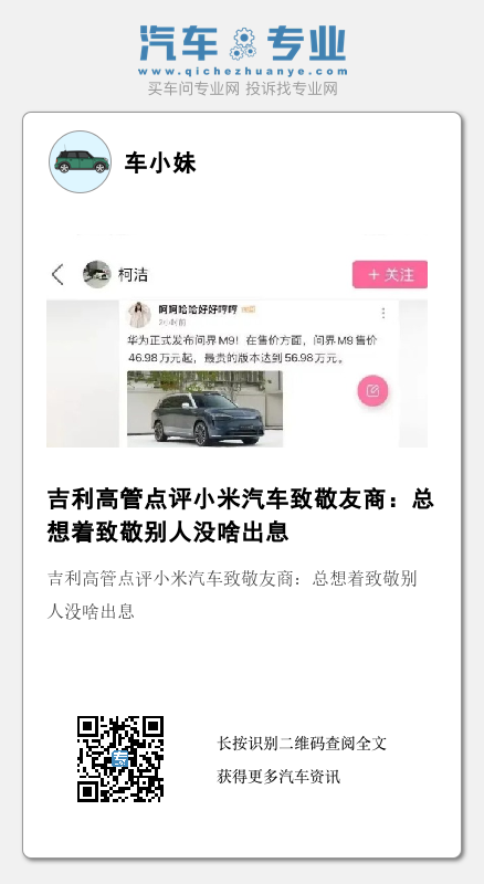 不过不少小米粉丝并不买账,而是不断在评论区留言,诸如:吉利在新能源赛道里面就是一个垫底的存在,别人致敬你干嘛;你家极氪喷的小米体无完肤,嘲笑黑他,我米不敢致敬啊,杨总,诸如此类。