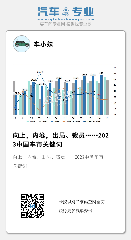 整体来看,尽管内卷不断,挑战重重,但2023年依然是充满收获的一年,在持续的竞争和创新推动下,车市呈现出新的生机和活力。即将进入2024年,充满未知,但也蕴含着希望。此前,中国汽车工业协会副总工程师许海东在2024中国汽车市场发展预测峰会上表示,预计2024年我国汽车总销量将达到3100万辆,同比增长3%。由此来看,尽管增长幅度有所下降,但依然有不小的空间。