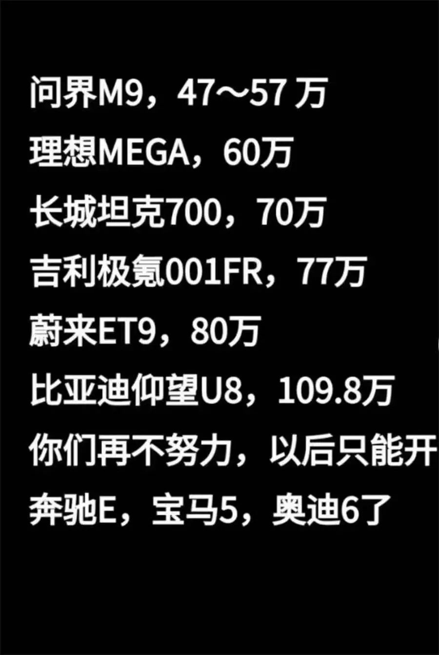 最近网络上也有热心网友贴出评论,列举了包括坦克700、仰望U8、极氪001FR等众多自主豪华车的代表,并表示:你们再不努力,以后就只能开奔驰E、宝马5系和奥迪A6了。