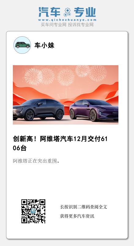 1月2日,阿维塔发布2023年12月销量数据,共交付6106台,创单月最高销量纪录,全年累计销售27589台。