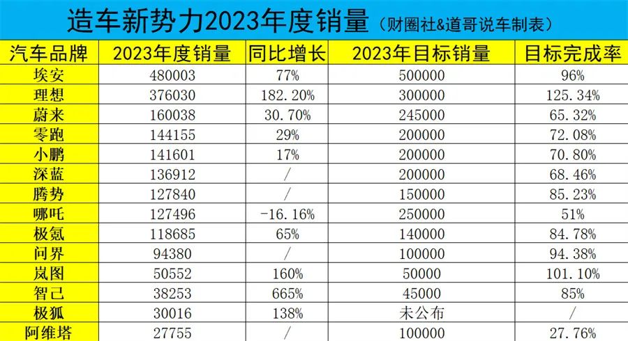 【文/财圈社&道哥说车 张浅 林示】2023年的车市在多轮价格战之下落下帷幕,各大造车新势力们的年度销量也随之火热出炉。纵观造车新势力们上一年度销量及目标销量完成情况,除哪吒汽车负增长外,其余品牌年度销量均实现不同程度的同比正增长,其中,智己汽车同比增长幅度最大达到665%,紧随其后的同比大增182.20%的理想汽车,岚图汽车则以同比大增160%排在第三。