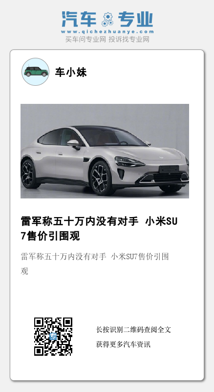 此外,当网友在雷军微博下讨论SU7价位问题时,其再次表示:“50万以内,有对手吗?”而此回复也引发外界猜测SU7最终价格或在20-50万元之间。