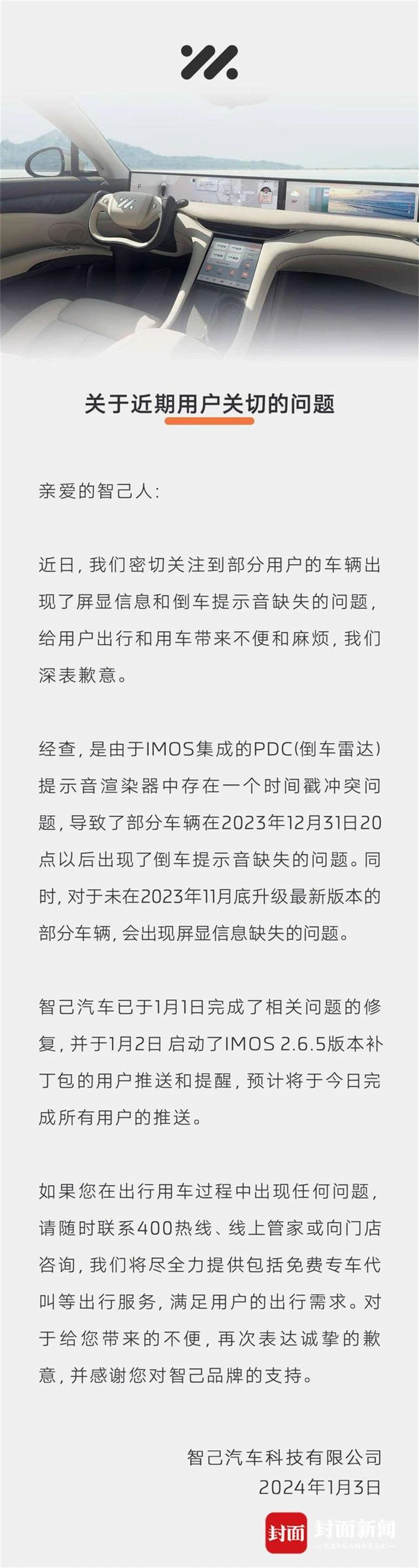 “由于IMOS集成的PDC(倒车雷达)提示音渲染器中存在一个时间戳冲突问题,导致了部分车辆在2023年12月31日20点以后出现了倒车提示音缺失的问题。同时,对于未在2023年11月底升级最新版本的部分车辆,会出现屏显信息缺失的问题”,智己汽车声明显示。