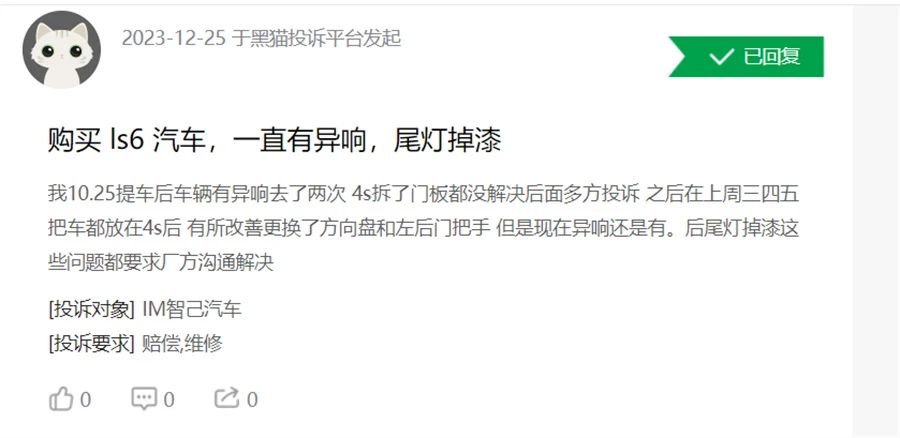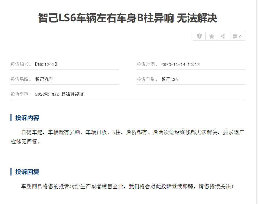 一位2023款Max超强性能版智己LS6车主在投诉中表示,“自提车起,车辆就有异响,车辆门板、b柱、后桥都有。后两次进站维修都无法解决,要求返厂检修无回复”。(车质网)