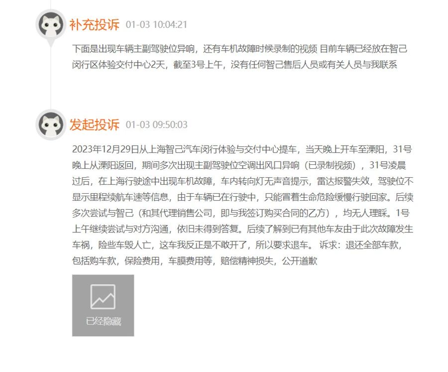 我们不妨代入一个案例,黑猫投诉中,一位智己lS6车主诉说了自己的经历:“2023年12月29日从上海智己汽车闵行体验与交付中心提车,当天晚上开车至溧阳,31号晚上从溧阳返回,期间多次出现主副驾驶位空调出风口异响(已录制视频),31号凌晨过后,在上海行驶途中出现车机故障,车内转向灯无声音提示,雷达报警失效,驾驶位不显示里程续航车速等信息,由于车辆已在行驶中,只能冒着生命危险缓慢行驶回家”。