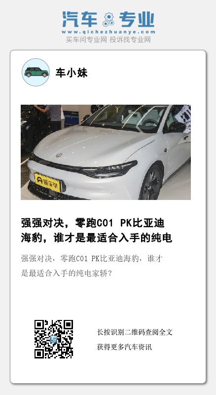 由于两款车的售价存在差异,我们的选取了官方售价为17.38万的零跑C01纯电606智享和官方售价为18.98万的比亚迪海豹冠军版550km精英型来展开分析,以下没有特别说明,均是指这两款车型。
