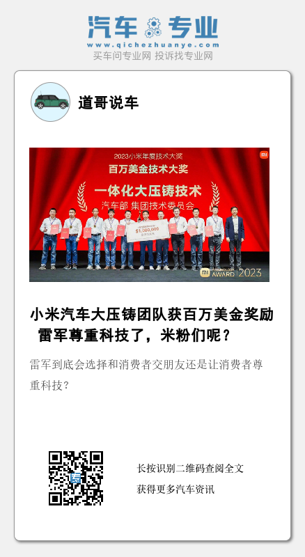 值得一提的是,在此前的小米汽车技术发布会上,雷军对小米汽车技术表现出了十分重视的态度,其表示,“不管花多少钱,不管付出多大代价,小米汽车一定要在核心领域做到全行业领先水平。”而此次百万美金年度技术大奖中,有关汽车的两个项目获奖无疑会增强小米汽车技术含金量。