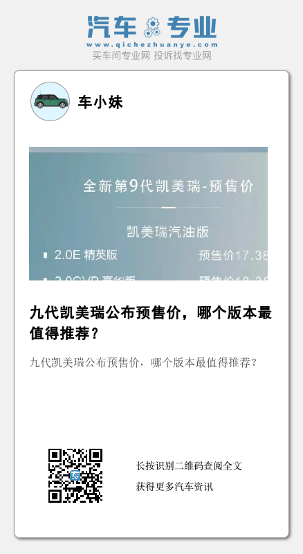 从预售价来看,凯美瑞智能电混双擎2.0HE 精英版,也就是混动版的入门级车型预售价18.18万元,这也是我们最推荐购买的版本。