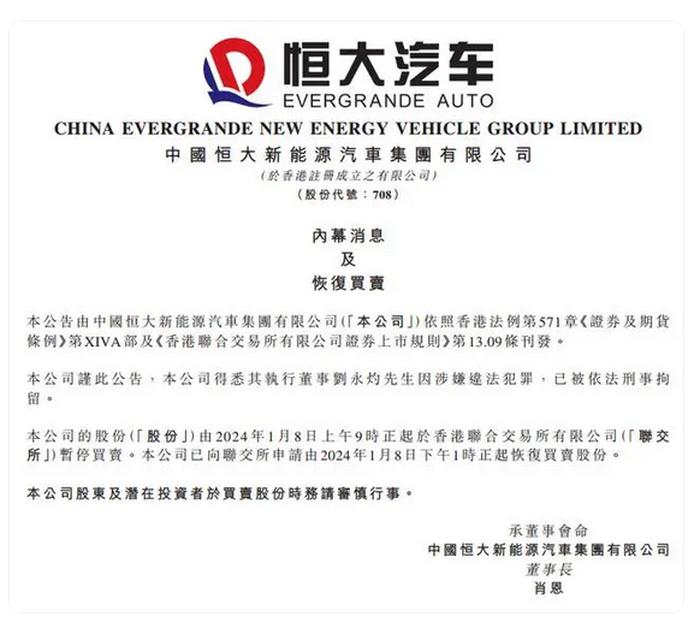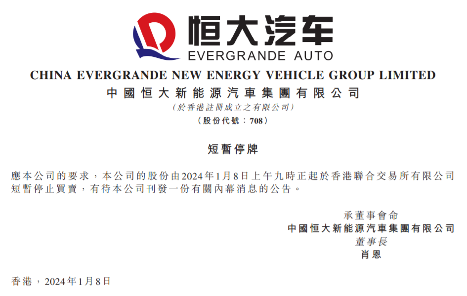 此前,恒大汽车在港交所早间公告,公司的股份由2024年1月8日上午九时正起于香港联合交易所有限公司短暂停止买卖。