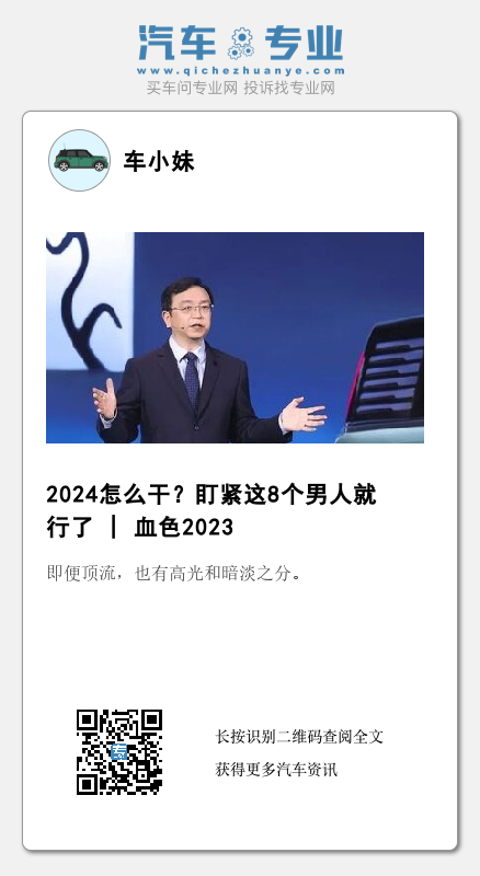 作为车圈最典型的代表,这8个男人一定程度上代表了汽车产业不一样的经营思路和方向,有正向的,也有反向的,对每家车企而言,无所谓对错。面对更加残酷的2024年,这8个男人又会带来怎么样的结果?一切还得交给时间。