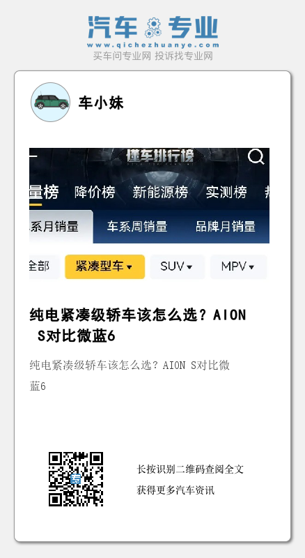 在懂车帝评分体系中,微蓝6的分数为3.65分,AION S的分数为3.67分,微蓝6的绝对分数虽较低不过在同价位车型中反而排名较高。
