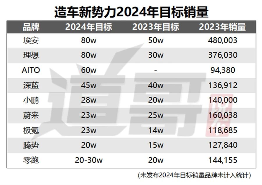 今年目标销量最有看点的就是埃安和理想,不约而同地定在了80万辆。尤其是理想,2023年目标还是30万辆,今年直接大翻倍,看来是对发展前景信心十足。相较之下,埃安的目标销量涨幅并不大,还不到2023年目标50万辆的一倍。
