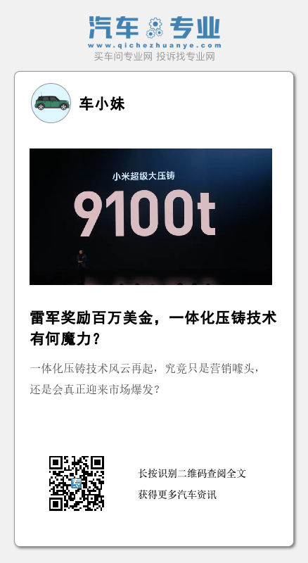 一体化压铸技术获此殊荣,足以说明小米汽车对这项技术的青睐。小米SU7技术发布会上,雷军还特地宣传了小米汽车全栈自研的9100吨一体化大压铸设备集群系统。一时间,一体化压铸技术被送上热搜。