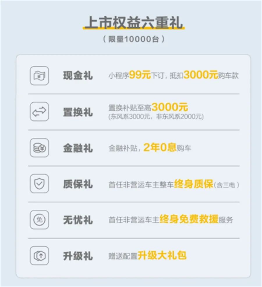 一一举例来看,现金礼小程序99元下定抵扣3000元购车款,相当于价格再便宜2900元,如果叠加置换礼补贴至高3000元,光是真金白金就足足少了5900元,这将会使得这款车的售价来到6.89-9.89万元区间,低配压到7万元以内,顶配压到10万元以内。再看金融礼两年0息购车,假如你只有两万块首付,低配车型在两年内0息分期付款,一个月只要付2000元便可在两年后完全摆脱“债务”,购车还款无压力。