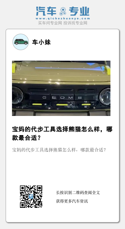 熊猫的电动机最大功率有20kw、30kw两种规格,工信部公布的纯电续航里程为120km、200km两种选择。短途出行可以满足。