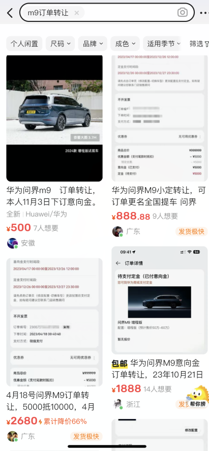 近日,二手平台咸鱼上出现了大量关于问界M9转让订单,从转让的价格来看,加价数额在500至10000元之间。这些转让的订单有在去年12月下单的,有8月下单的,甚至还有在6月盲定的限量2000辆先行者计划订单。
