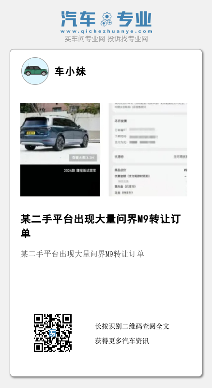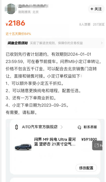 有网友发帖表示:已收到先行者计划邀约,有效期到2024-01-01 23:59:59,可在春节前提车。问界M9小定订单转让,价格不包含五千订金,可以配合去北京销售门店转让,直接和销售对接。同时,还罗列出来小定订单可以额外享受小定五千折扣、可以随意更换纯电和增程,配置任选、还有一万下单商业折扣等权益。针对问界M9转让订单出现在二手平台,赛力斯方面回应表示:“感谢大家对问界M9的支持和认可,鼓励大家通过官方渠道咨询、了解、下单、提车,享受更完善的用户体验和服务品质。”