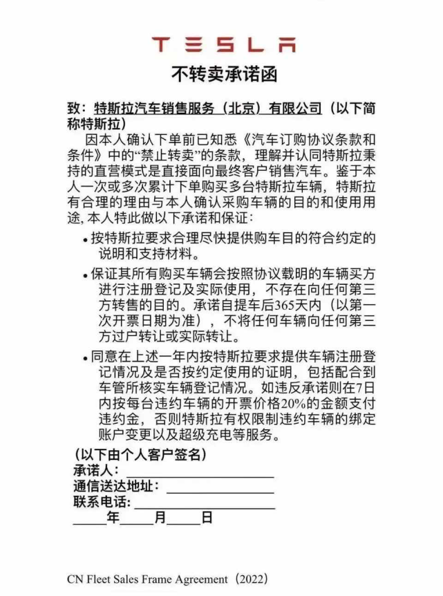对于转让订单这种行为,不少车企也相继推出政策。早前特斯拉就被传出要求客户签署“不转卖承诺函”。该政策主要针对部分用户一次或多次累计下单购买多辆特斯拉汽车,特斯拉要求这些用户承诺自提车后一年内不向任何第三方过户转让或实际转让,如果违约需支付车辆开票价格20%的违约金,否则特斯拉有权限制违约车辆绑定账户变更以及超级充电等服务。