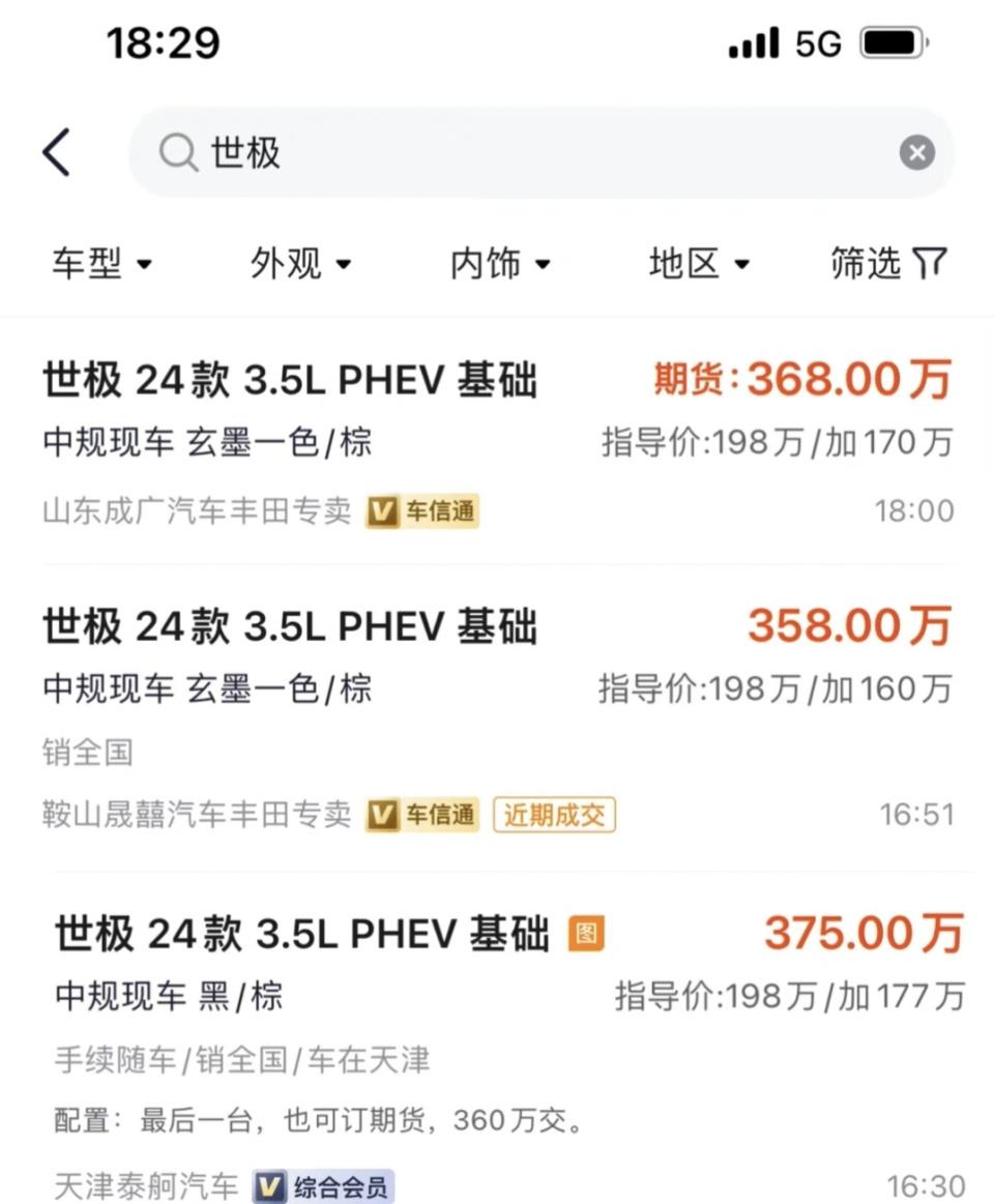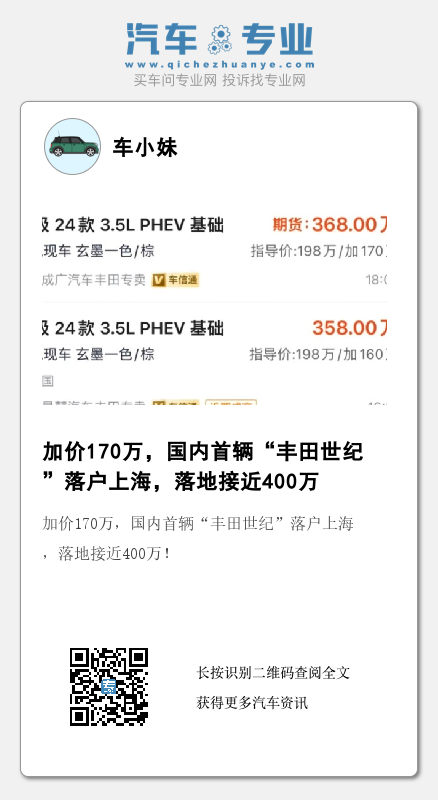 丰田“世纪”已经在去年的广州车展正式官宣,其实在广州车展之前,这款车就已经在东京车展亮相,因为国内“世纪”的商标已经被抢占,所以无奈改名为“世极”。新车官方指导价198万,在亮相之初,就有媒体大胆预测,以这款车目前的热度,未来加价已经成为定局,而事实上丰田也是这么做的。从最近一些终端市场所得出来的消息,这款丰田“世纪”的终端价平均加价超170万,整个势头更是堪比当年的加长版迈巴赫S。而且因为终端车辆有限,所有大部分都是以期货的形式出售,也就是加价170万还需要等,不知道终端将近400万的丰田让宾利情何以堪!
