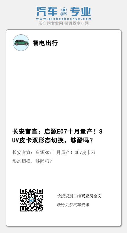 长安汽车总裁、党委副书记王俊在2024长安汽车全球伙伴大会上透露,长安启源E0系列首款车型CD701(内部代号)将于10月量产,四季度上市。CD701命名为E07,基于SDA智能电动超级数字化平台打造,采用大角度溜背造型,可实现SUV与皮卡间的双形态切换,车内使用5座布局,提供单电机后驱、双电机四驱版可选。