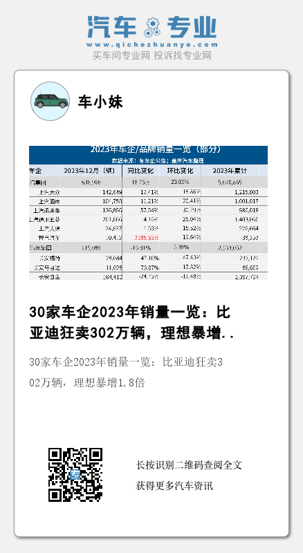 比亚迪自然在内。2023年全年,比亚迪累计销量3,024,417辆新车,同比增长61.9%。在这样的体量下仍能够保持这样的增幅,不可不谓优秀。由此,比亚迪也成为少数几家能够达成年度销量目标的车企之一。