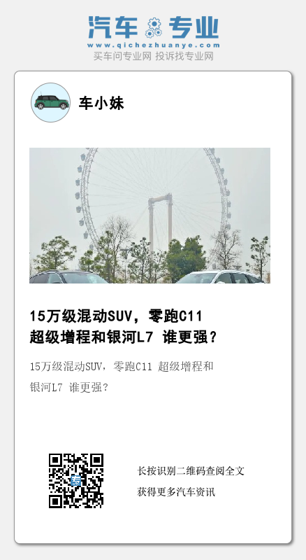 通过对比,不难发现,银河L7作为主流插混SUV,当然值得选择。不过,零跑C11超级增程的乘坐空间和舒适性体验出色、纯电续航更长、智能化表现优秀,尤其是在当下,面临着冬季低温和回家过年的大前提下,零跑C11超级增程更值得推荐。