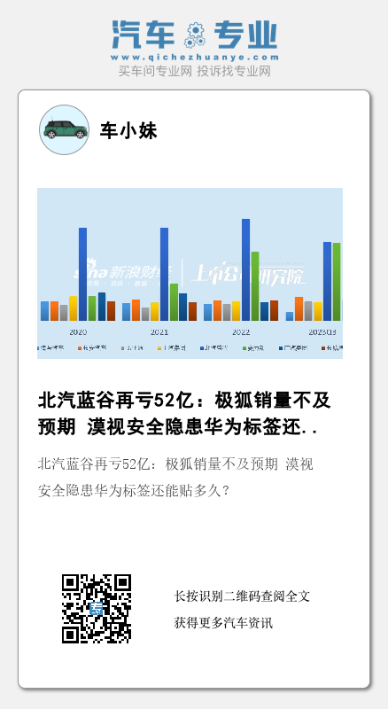在连续几年的极低销量后,2023年,北汽蓝谷全年销售汽车9.2万台,同比增长83.69%,月均销量仍不到万台。特别是公司拳头产品极狐阿尔法S(配置|询价)等车型销量惨淡。